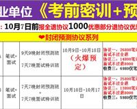 课程优惠:报名导师基地系列10月31日前优惠3000元!课程特色:1、课程安排课程安排:100天笔试课程+月度时政班;2、封闭式培训封闭式培训:早读+上课+晚自习全天严密课程组织;3、学习师课程督学:上课期间学习师督学服务;..